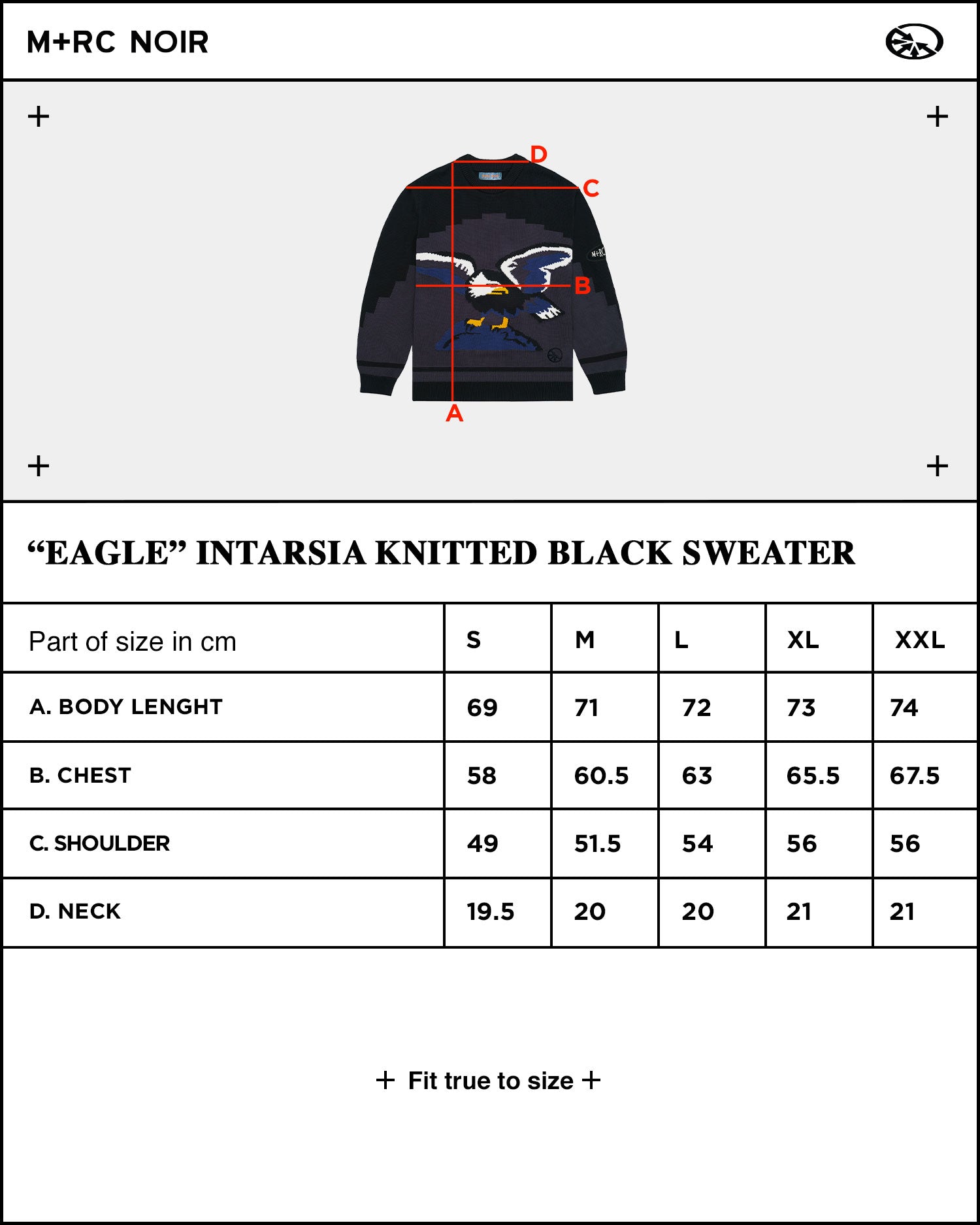 Crafted from 100% knitted pima cotton, this sweater offers a blend of comfort and luxury. The traditional intarsia eagle artwork adds a touch of sophistication, while the chain embroidered logo on the back and Chenille M+RC NOIR on the sleeve bring a hint of streetwear vibe. Featuring a small circle embroidery on the front bottom, this sweater is a true statement piece.